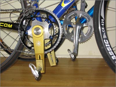 Meanwhile, I have been working with two riders (one a cat 3, the other a masters racer) who are recent PowerCranks converts, giving them advice I have acquired over my own short tenure. I had them each set their PowerCrank bikes up on a trainer, with instructions to do between 5 and 15 minutes on the PowerCranks, before and after every ride. Of course, predictably, neither could contain their excitement and were out on the road after only a few days, showing off to all their friends and of course, later on experiencing the severe muscle pain that I was trying to help them avoid in the first place.
