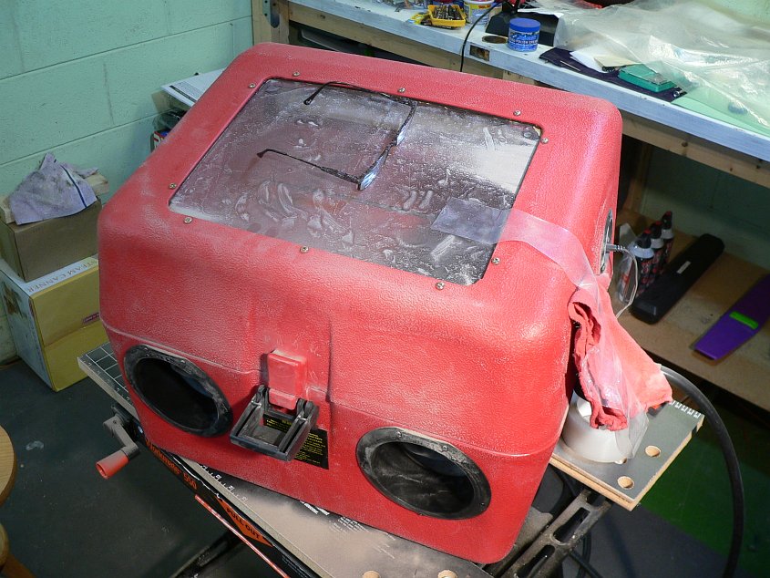 now we bring our parts to the magic box for refinishing using 220grit aluminum-oxide @ 35psi. even though the box is "sealed" alot of crap sneaks out thru the seams and makes a mess.