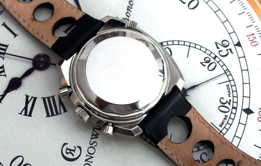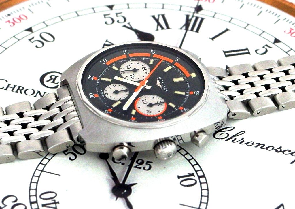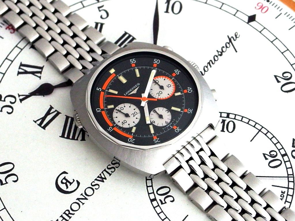 - Movement: hand-wound Longines 330 (Valjoux 72) chronograph with column-wheel switching.
